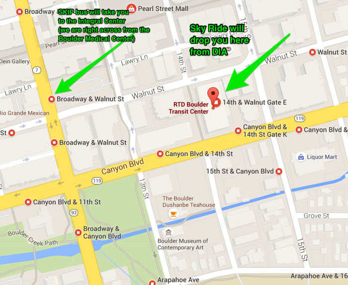 The Boulder Skip Bus goes up and down Broadway, stopping at the Center every 7 – 15 minutes. Broadway is Boulder’s main north-south artery traveling to Boulder’s famous Pearl Street Mall downtown area, Colorado University, and many convenient hotels.